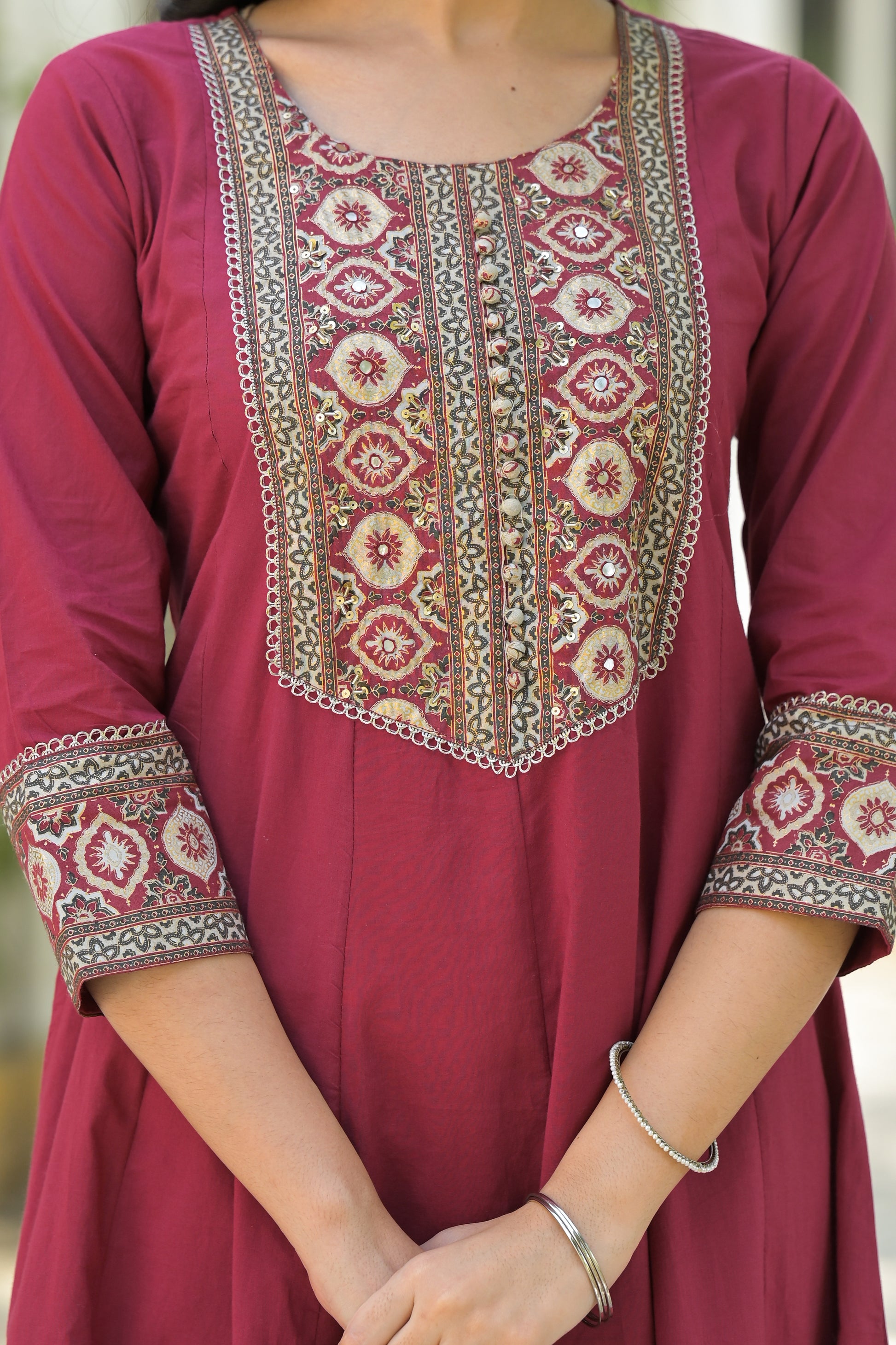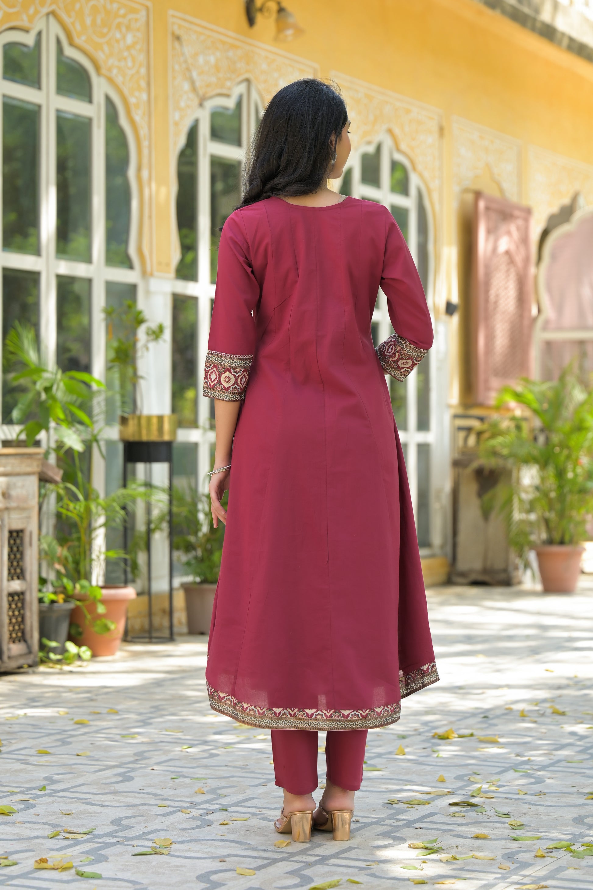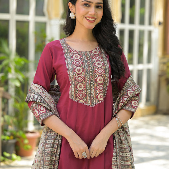 A blend of grace and comfort, this cotton suit set features elegant floral prints with intricate detailing on the neckline, sleeves, and dupatta. Made from breathable fabric, it's ideal for day functions, poojas, or casual festive gatherings.