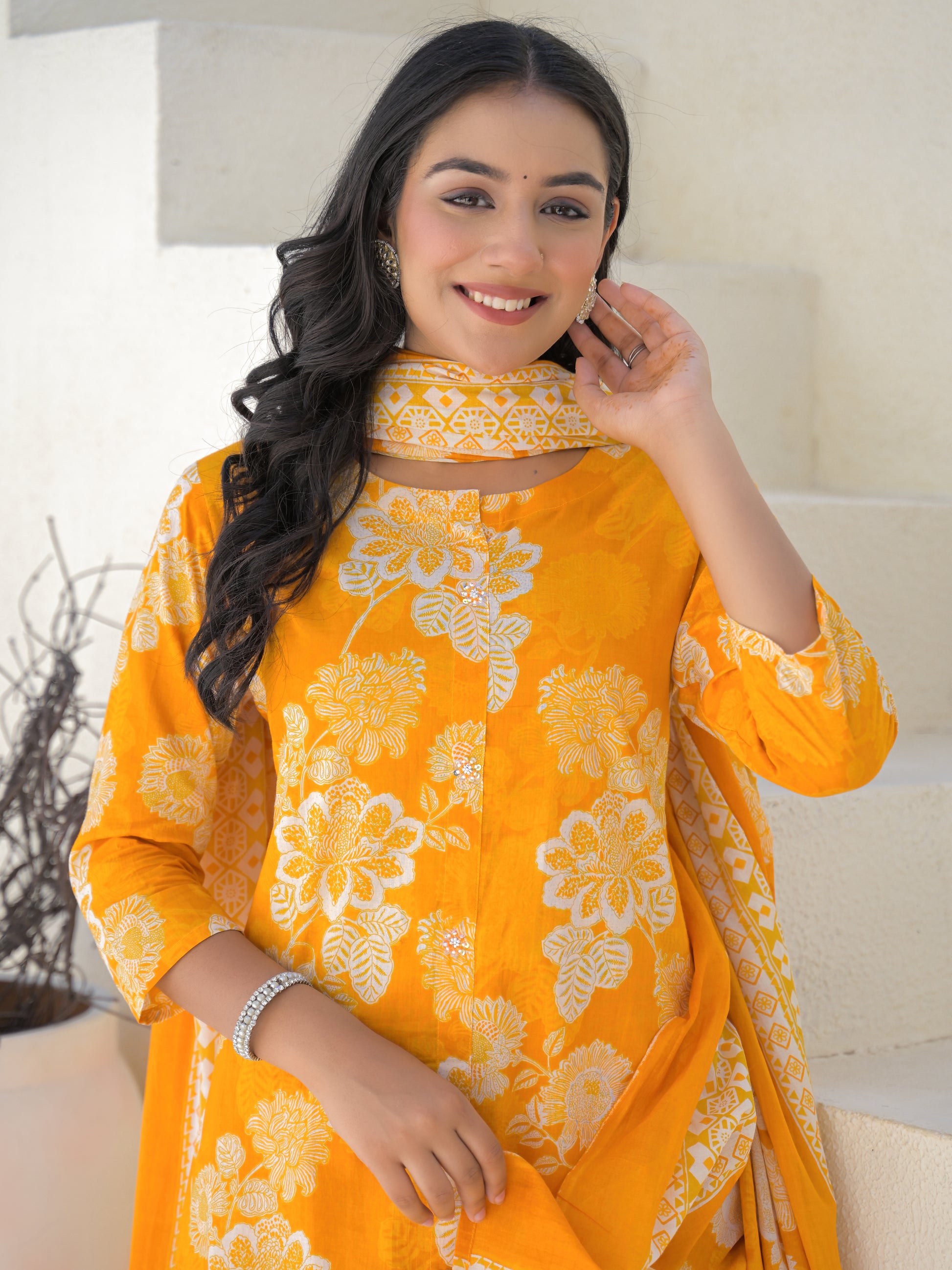 Effortlessly elegant, this cotton kurta set features delicate floral prints and a breezy silhouette that keeps you comfortable all day. Paired with a matching dupatta and straight pants, it's perfect for everyday wear, festive gatherings, or relaxed brunches.
