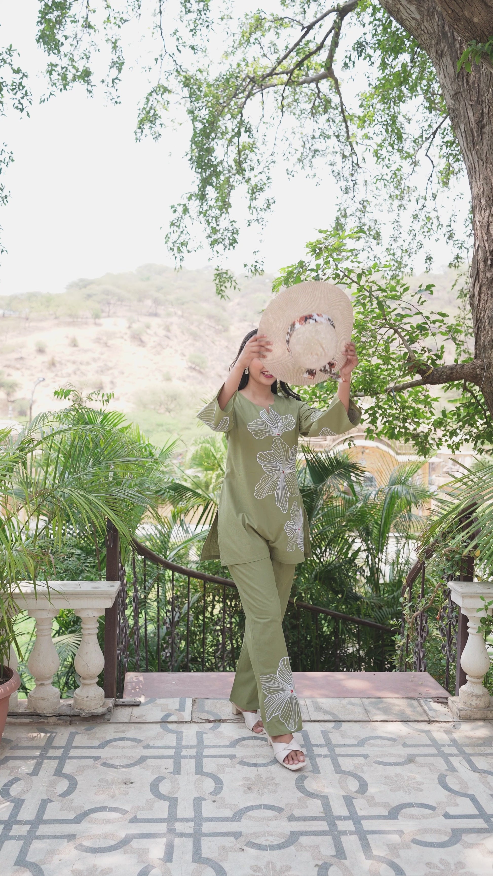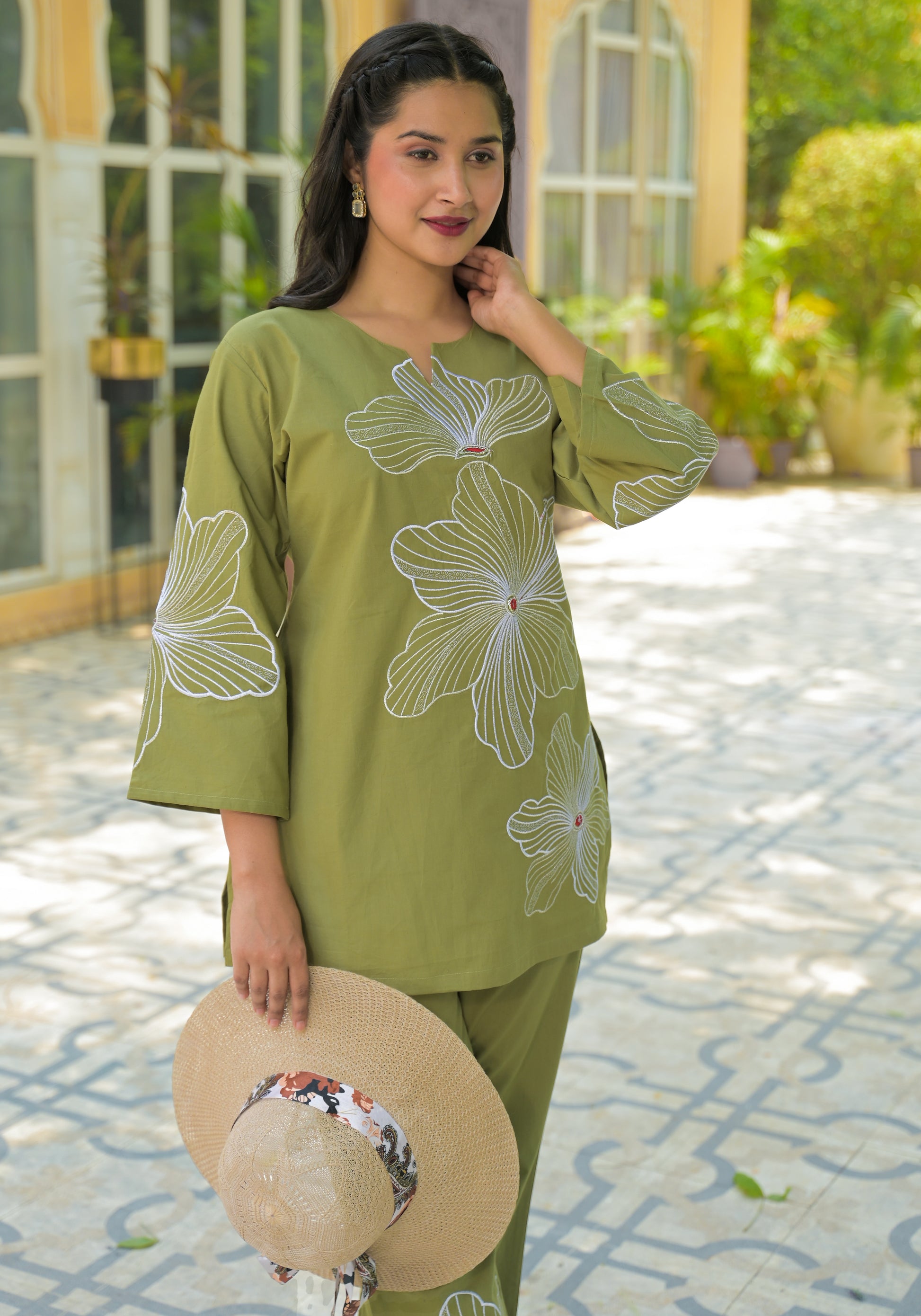 Step into effortless elegance with our Olive Bloom Co-ord Set. Crafted from soft, breathable cotton, this relaxed-fit set features delicate white floral embroidery with subtle red bead accents, adding a touch of understated charm. The straight kurta is designed with three-quarter sleeves and a flattering notch neckline, paired perfectly with ankle-length trousers that mirror the floral detail for a balanced, coordinated look. Ideal for day outings, brunches, or a casual workday, this ensemble blends comfort with contemporary style.