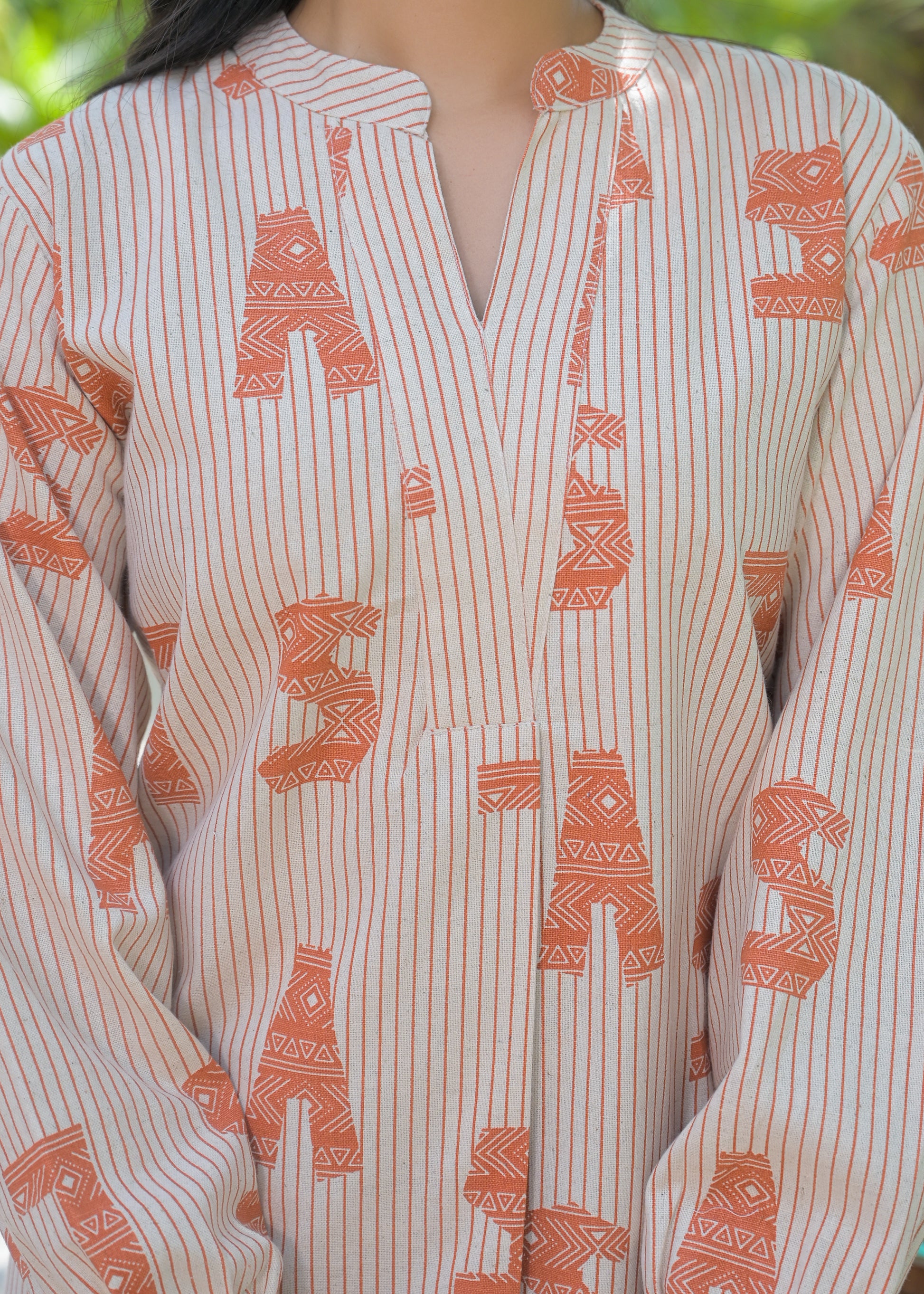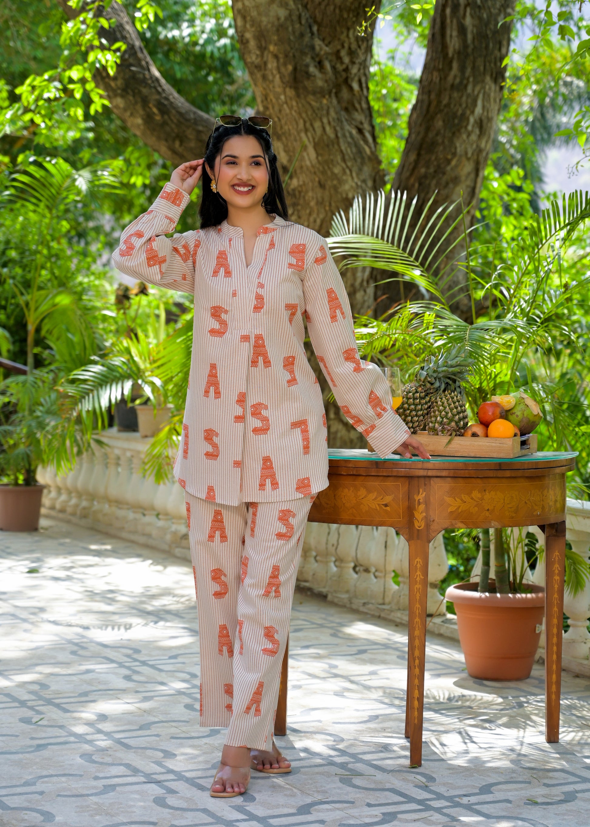Crafted in comfy fabric, co-ord set features quirky block-style letter motifs for that playful edge. The relaxed-fit shirt with a mandarin neckline pairs seamlessly with straight pants — perfect for brunches, lounging, or breezy outings.